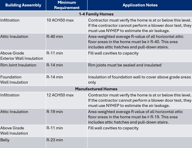 The below table represents the updated minimum insulation requirements a residence must meet prior to the installation of a heat pump through EmPower+. These updated envelope requirements are for work scopes submitted to the program beginning March 18, 2026.